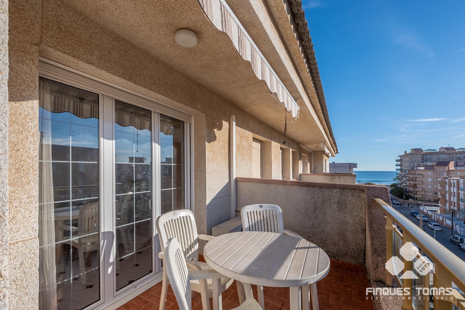 Presentamos este exclusivo piso de tres dormitorios en primera línea de playa en Cunit, con vistas laterales al mar y una excelente orientación que le aporta mucha luz natural durante todo el día. Una propiedad que destaca por su confort, funcionalidad y ubicación privilegiada, ideal para familias que desean disfrutar del entorno mediterráneo.~~Ubicada en una finca del 1997, la vivienda cuenta con una superfície construida de 76 m² y una distribución muy bien aprovechada. Al entrar, un elegante recibidor da paso al amplio y luminoso salón comedor con acceso directo a la terraza con vistas laterales al mar, perfecta para comer al aire libre o disfrutar de la brisa marina y el clima mediterráneo. La cocina independiente está completamente equipada, bien distribuida y diseñada para aprovechar al máximo el espacio. La zona de noche consta de tres dormitorios; dos dobles muy amplios con armarios empotrados y uno individual, ideal para crear un despacho, vestidor o habitación infantil. El dormitorio principal es en suite, con baño privado con bañera. La vivienda dispone de un segundo baño completo con bañera para mayor comodidad.~~El piso se encuentra en una primera planta de un edificio con ascensor y ofrece vistas al mar ya desde la propia planta. Incluye también plaza de parking exterior cubierta y trastero, comodidades imprescindibles en la zona. Situado en una zona privilegiada con acceso directo al paseo marítimo, este piso ofrece tranquilidad, buena comunicación y cercanía a todos los servicios –farmacias, supermercados, comercios y restauración–.~~Una joya inmobiliaria en una de las zonas más solicitadas de la localidad, perfecta como primera o segunda residencia. Contáctanos para más información o para realizar una visita privada.~